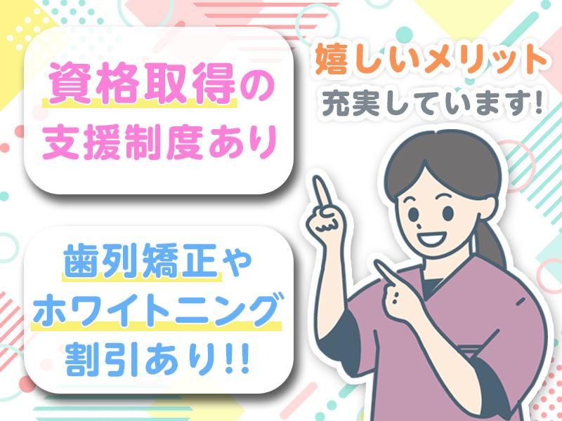 【保険制度】 雇用保険、労災保険、健康保険、厚生年金 待遇・福利厚生 【福利厚生】 ◎昇給あり ◎ミニボーナスあり ◎交通費全額支給 ◎自転車通勤あり ◎ホワイトニング割引あり ◎矯正割引あり ◎資格取得支援制度あり ◎社員登用制度あり ◎ネイルOK(色のみ) ◎ピアスOK(ぶら下がらないもの)