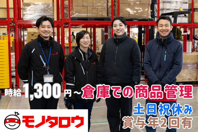 \高時給1,300円~&賞与年2回!/ 安定収入の在庫管理スタッフ!ナイト手当でさらに稼げる◎ モノタロウ物流センター内での在庫管理スタッフを募集! 勤務曜日は相談が可能。 若手~中高年の方まで、毎日約500名ほどが活躍中の職場です。 始めるにあたり特別な知識・資格・経験は不問! 未経験の方も安心してスタートできますよ♪ ■有給休暇は半休・時間単位でも取得可能!! ■季節ごとのお菓子の配布など楽しいイベント有 ■快適さを考慮した支給品(飲料品、貼るカイロや冷えピタシートなど)多数 ◎給与面はもちろん、それ以外にも魅力がたくさん! ライフスタイルに合わせてムリなく快適に働きませんか? みなさまのご応募をお待ちしています。