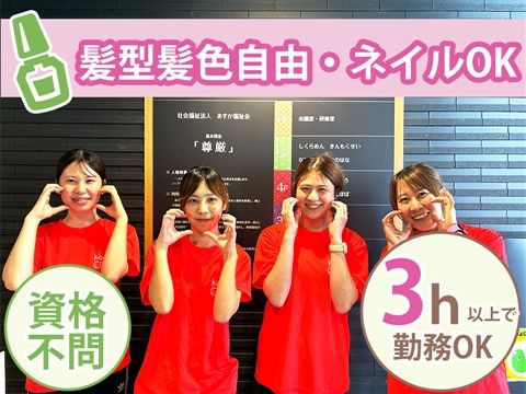 孝の季苑のおすすめポイント! 【 髪型・髪色自由!ネイル・カラコンもOKです! 】 介護施設で働くからと言って、ネイルやカラー、諦めていませんか? 当施設では、ご入居者様に不利益がなく、清潔感があり安全が守られていれば、介護業界には珍しく、髪型・髪色自由、ネイルやカラコンもOKです! オシャレも楽しみながらやりがいある仕事に就いていただくことが可能です! 【 夏は花火も楽しめます! 】 施設からは「たたら祭り」の花火がよく見えるため、花火の際には敷地内を職員やご家族にも開放しています! 職員からも好評です! 特別養護老人ホーム孝の季苑について 特別養護老人ホーム孝の季苑は、法人初の関東エリアの施設として2018年に開設しました。 川口市の住宅街で温かく地域に見守られている特別養護老人ホームです。 理念である「尊厳」に基づいて、一人ひとりの生活スタイルを大切にした介護ケアを心がけています。 ■開設:2018年3月1日 ■定員:入所160床、短期入所20床(10名×18ユニット) 働くスタッフに訊きました! <<1日のスケジュール例>> 8:30出勤~8:40申し送り、口腔ケア、排泄介助、水補準備、補水介助 ↓ 11:00~11:30昼食準備 11:30~12:00昼食(食事介助) ↓ 口腔ケア、排泄介助、PM入浴介助、空いた時間でケース入力 <<おすすめポイント>> ◎施設の雰囲気がよく、入職を決めた理由も当時対応してくださった上司が優しく丁寧に説明してくださったからです ◎行事や企画等はやりたいことがあれば自由にやらせてもらえます ◎上司に相談しやすく、わからないことはわかるまでサポートしてくれます ◎法人内の他施設で学ぶ場があります ◎入居者様との一対一の時間が取りやすく、ありのままの入居者様と関われることが良いと感じています 社会福祉法人あすか福祉会について 社会福祉法人あすか福祉会は1982年、長崎県の対馬市に「尊厳」を法人理念と定め創設しました。 九州、関西、関東エリアで介護施設や事業をはじめ、保育所や地域子育て支援にも取り組み、地域に合わせた最善サービスの提供に尽力しています