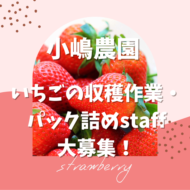 仕事内容 ✅2026年5月末までの短期/6月以降も可 ✅午前中でサクッと稼げます♪(希望者には午後の仕事もあります) ✅扶養内勤務希望やWワーク希望から、 「しっかり稼ぎたい」まで幅広く歓迎 ✅仕事帰りに規格外のいちごをもらえる☆ ビニールハウスで育てている 「いちご」の収穫などをお任せ! 天候に左右されず計画的に育てられるため 収穫量は安定=仕事量も安定です◎ 《お願いするお仕事は…》 *いちごの収穫作業 *収穫したいちごのパック詰め その他、能力に応じて 管理作業もお任せします。 【こんな方にもオススメです】 「未経験から始められる仕事がしたい」 「イチから教えてもらえる環境で働きたい」 「今までの経験を活かして働きたい」 「扶養内の範囲で働きたい」 「未経験者を採用している職場で働きたい」 【バイトデビューもOK】 少人数体制で風通しの良い、 明るくアットホームな職場◎ 「困ったときはお互い様」という 考え方が根付いているから、 わからないこともスグに聞けますし、 定着率も高いんです。 「初めてだから少しずつ慣れていきたい」 という方も不安を解消できるよう スタッフみんなでサポートするので、 安心してスタートできます◎ 【自分のペースでOK】 はじめは簡単作業から始めて、 仕事に必要なことを学んでいきましょう。 自信がつくまで先輩がサポートするので 「やってみたい」という気持ちがあればOK! 一人ひとりのペースを尊重するので、 無理せず少しずつ慣れていってくださいね。 【ここだけは覚悟してね】 いちごの収穫作業なので体を使うお仕事になります! 収穫中、低姿勢になることも多いですが、良い運動になります♪ ちょっと自信のない方でもお気軽に相談くださいね! また今回は短期の募集ですが、 長期希望の方もぜひご相談ください! ※転勤はありません