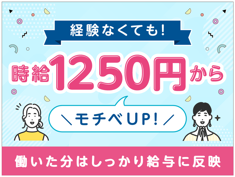 時給1,250円以上 給与詳細 基本給:時給 1250円 〜 ※試用期間は入社日~入社翌月末日まで ◎【通勤手当別】通勤手当実費支給 ◎残業代は1分単位で支給 ◎評価をもとに昇給もあり、収入アップ可能!
