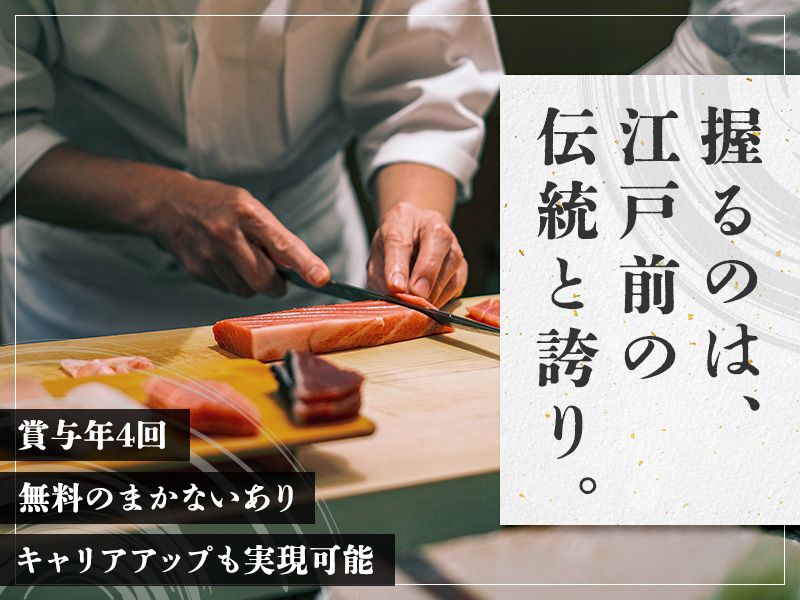 仕事内容 _____________ 伝統のある江戸前寿司――。 熟練の技を継承します。  ̄ ̄ ̄ ̄ ̄ ̄ ̄ ̄ ̄ ̄ ̄ ̄ ̄ >>――求人の特長はコチラ!――<< 1|賞与年4回!年間20~80万円支給 2|昇給年2回+各種手当も充実 3|マンツーマンで覚えるまで指導 4|新卒であれば未経験OK 5|無料で美味しいまかないあり 6|スタッフの意見も大切にする職場 【 お任せしたい仕事 】 江戸前寿司店にて、 板前としての業務をお任せします ▽具体的な業務 ●接客 ●仕込み ●板場での調理 ●清掃 ●仕入れ ●在庫管理 【 教育体制 】 マンツーマンで丁寧に指導します! 覚えるまでじっくり教えるので、 経験が浅い方でも安心の環境です 新卒の方は未経験でも問題ありません! さらに基礎的な部分からお教えします