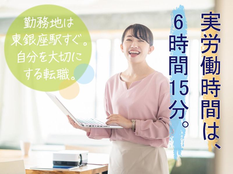 職場環境 ◎中途入社者が90%以上です。 ◎オフィスは東銀座駅から徒歩1分。仕事帰りの時間も充実させられる好立地です。 ◎全社員20名の落ち着いた職場。役職ではなく「さん」付けで呼び合うフラットで穏やかな社風も働きやすさの理由の1つです。 喫煙所:なし(敷地内全て禁煙)