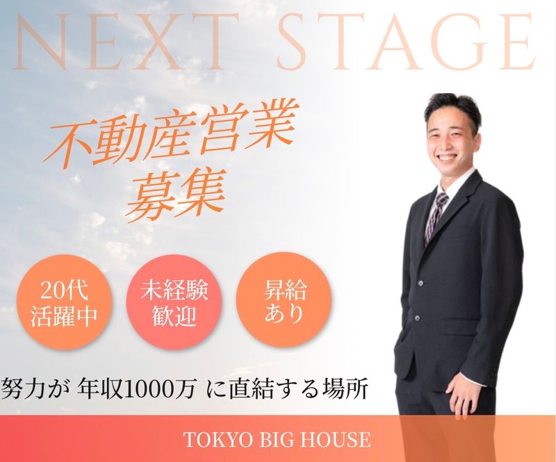 アピールポイント: ◆このお仕事の魅力 未経験9割でも即戦力になれる、戦略的サポート体制 入社後は先輩との1on1同行・ロープレ・定期的なフィードバックで、営業が初めてでも最短で成果を出せる環境を整えています。「やる気はあるけど経験がない」という方こそ、大歓迎です。 AIツール×個人スキルで、業界最高水準の収入を狙える 最新の営業支援ツールを活用しながら、個人の能力を最大化。20代で年収825万円達成者も在籍しており、努力が収入に直結する仕組みが整っています。 キャリアの「次のステージ」を本気で描ける会社 肩書きだけの安定より、本当の意味で自分の未来を切り開きたい方へ。TOKYO BIG HOUSEは「全ての人に住み替え自由を」というミッションのもと、20代が主役になれる会社です。