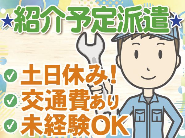 仕事内容 【お仕事おまとめ情報】 ◎スタッフ急募! 時間:8:00~17:00、20:00~05:00(2交替制) 休日:土日他(会社カレンダーによる) 高時給:1,450円+交通費支給 ・男女スタッフ共に活躍出来るお仕事です ・未経験者でも丁寧に指導します。 ※この求人は紹介予定派遣の求人案件です。3ヶ月~6ヶ月を派遣社員として勤務。その後派遣先と本人の希望が 合えば派遣先の正社員として勤務していただきます。 【作業内容】 自動車部品の加工 具体的にはバネ加工のお仕事となります。 機械にバネを投入後スイッチON。 加工後機械から出て来る製品を箱詰めしていただきます。 一定数で抜き取りの検査も有ります。 未経験者でも問題有りません。 先輩社員がフォローします。 ◎ものづくりに興味のある方お待ちしております。 ◎未経験でも活躍出来るお仕事です。 未経験の方でもしっかりとサポートいたしますので、 工場勤務に不安のある方でも安心してスタートできます。 分からない事や難しいことがある場合は 仕事が始まる前からでもご相談ください。 【こんな経験活かせます】 過去に、製造業や工場でのお仕事を経験している方、 品質管理、生産管理、工程管理、 マシンオペレーター、機械加工、組立、ベンダー経験者、 軽作業や倉庫内作業、食品製造、フォークリフト作業、 工場作業員、ピッキング・仕分け・検査・検品・組立等の お仕事経験のある方は過去の経験を活かして働けます。 もちろん製造業未経験の方でも しっかり指導・サポートしますので安心して下さい。 まずはお気軽にご連絡下さい。 若手から中高年の方、幅広くご応募お待ちしております。