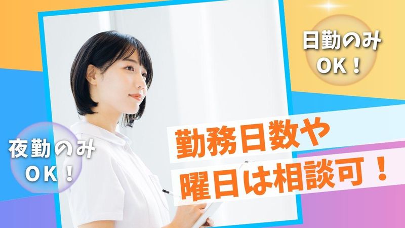 仕事内容 ✨ オープニングスタッフ募集 ✨ 【アルバイト・パート/看護師・准看護師】 ━━━━━━━━━━━━━━━★☆…・☆ 新しく立ち上がる 障害福祉サービス事業所で、 オープニングメンバーとして 《看護師・准看護師(非常勤)》を募集。 今回はアルバイト・パート募集のため、 フルタイム勤務が難しい方や ブランクのある方も無理なく働ける環境です。 当施設では、身体障がいや 知的障がいのある方に加え、 痰吸引や経管栄養などの医療的ケアが 必要な重症心身障がいのある方も 積極的に受け入れる予定です。 ⭐この募集のポイント⭐ ✅オープニング募集(全員同じスタート) ✅アルバイト・パート(非常勤) ✅ブランクOK・実務経験不問 ✅看護師資格を“無理なく”活かせる 病院勤務のように 常に緊張感のある医療行為が中心ではなく、 福祉の現場で利用者様の生活に寄り添う看護がメインです。 「医療現場の忙しさから少し離れたい」 「看護師資格を活かしながら、落ち着いた環境で働きたい」 そんな方にも選ばれています。 - ⭐具体的な仕事内容⭐ ⏩利用者様の健康管理 ⏩日常生活のサポート └入浴介助・食事介助・排せつ介助など 必要に応じて 痰吸引や経管栄養など医療ケア、 自宅や通所先への送迎の添乗もお願いします。 重い障がいをお持ちの方でも、 「その人らしい」生活を継続できるよう 寄り添ったサポートを目指しています。 綺麗な新しい環境で、 一緒に施設の文化を創っていきましょう! - ⭐勤務シフト例について⭐ 夜勤を含むシフト制ですが、 ご希望に応じて柔軟な働き方も相談OK✿ ①基本パターン 夜勤→明け→早番→中番…など 時間帯を固定しない基本シフト ②日勤メインの一部夜勤パターン 平日は日勤中心で働き、 土日のみ夜勤で働くシフト 他にも、日勤専従・夜勤専従など 働き方は様々。 あなたの生活スタイルや プライベートに合わせた 無理のない働き方を 一緒に見つけていきましょう!