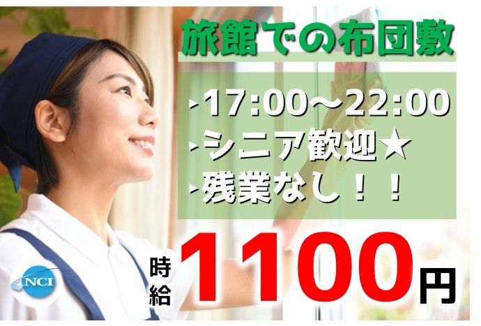 仕事内容 【夕勤専属、お部屋の準備】 ◎下記のお仕事をお願いします。 ・布団敷き ・夕食の片付けや朝食のセット 〇お客様が食事をしているときに客室の布団やシーツを準備していきます。 また、夕食後の食器の片付けや、翌日の朝食会場のセットなどもお願いします。 〇5人でチームになってお仕事を進めていきます! 未経験の方でも心強いですね◎ 〇就業時間は17:00~22:00の夕勤! Wワークでの就業もOK!(弊社にて規定があるのでご相談下さい) / ・制服貸与 ・駐車場、個人ロッカーあり ・休憩室あり \ ===ここもチェック!=== 〇長期 〇未経験OK 〇ブランクOK 〇フリーターOK 〇U・Iターン歓迎 〇第二新卒歓迎 〇交通費支給 〇車通勤OK 〇40代以上応募可 〇50代以上応募可 〇60代以上応募可 〇社会保険完備 〇正社員登用あり 〇各種手当あり 〇健康診断あり(年1回/会社負担) =================