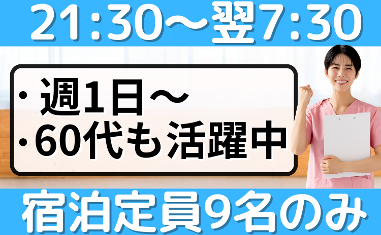 ■WワークOK ■21:30~翌7:30 ■シフト柔軟 ■経験があれば無資格歓迎 ■シニア世代活躍中