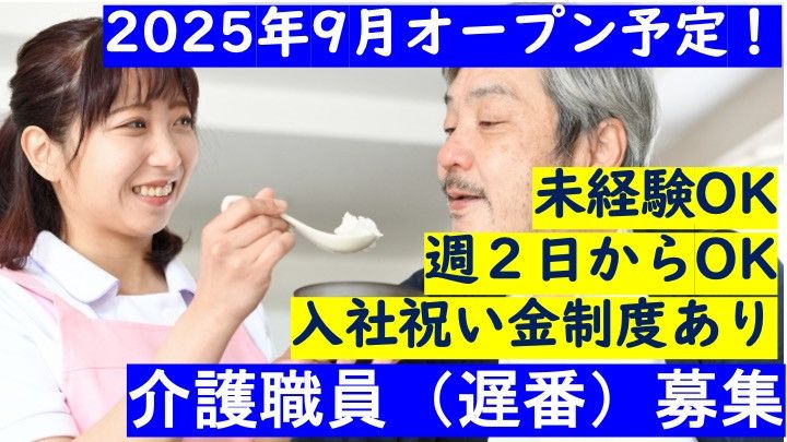 【アピールポイント】 サービス付き高齢者住宅の介護スタッフ(遅番)募集! ■週2日からOK! ■オープニングスタッフ! ■入社祝い金制度あり! ■資格取得支援制度あり! ■未経験・ブランクある方歓迎!
