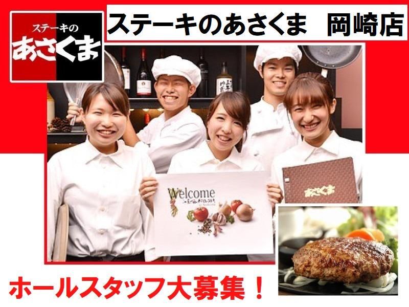 仕事内容 ・。~~~~~~~~~~~~~~~~~ ✨ステーキのあさくま 岡崎店✨ 春の増員募集! 学生さんのアルバイトデビュー・ 主婦・主夫さんのパートデビュー応援! 新年度が始まる前の 余裕のあるタイミングに頑張れば 仕事も早く覚えられる◎ しっかり稼げて一石二鳥♪ ~~~~~~~~~~~~~~~~~・。 お客様の案内やオーダーの受け付け、 料理の提供、席の片付け、清掃などを お願いします。 *ホール専任OK! *キッチンと両方やってみたいも相談OK! 飲食店(レストラン・カフェ・居酒屋)・ 接客・販売・サービス経験者、大歓迎! もちろん未経験も歓迎です!