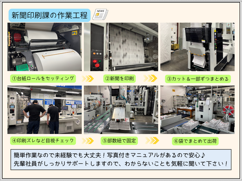 仕事内容 \学歴・経験不問!高卒・短大卒も大歓迎/ ✨【機械オペレータースタッフ募集】✨ 【⏬仕事内容】 新聞を印刷する工場で、印刷機の操作・メンテナンス、印刷準備などを行う機械オペレーター業務です。 印刷物のセット、機械の立ち上げ、稼働チェック、品質確認など、機械を扱う工程が中心。 チームで作業を行い、その日その日の印刷スケジュールに合わせて、協力しながら作業を進めていきます。 先輩に聞きながら働ける環境なので未経験の方も安心して働けますよ♪ ≪1日のスケジュール例≫ ⏰17:00| 出社・着替え、ミーティング(印刷物の確認・作業内容の共有) ⏰17:15〜| 印刷スタート(機械の点検・用紙やインクの準備なども含む) ⏰19:30〜| 休憩(30分) ⏰20:00〜| 印刷作業の続き ⏰23:20| 片付け・翌日の準備 ⏰23:30| 退勤 お疲れ様でした! ≪新聞ってどんな役割?≫ 新聞は、毎日の出来事や大切な情報をまとめて届ける役割を果たしています!政治や経済のニュースだけでなく、地域の話題や暮らしに役立つ情報まで知ることができます。 スマホやSNSでは情報が多すぎて、正しいことと間違ったことの区別がむずかしいですが、新聞は専門の記者が取材して事実を確かめたうえで伝えています!! だから、安心して情報を受け取れるのが大きな役割です。人々が正しい情報を共有できることで、社会全体の安心や信頼にもつながっています✨ 【⏬魅力ポイント】 ✅短時間勤務!実働6~7.5時間で体の負担も少なめ♪ ✅夕方からの勤務!日中は自由時間◎ジム、趣味、推し活、家族時間などプライベートも充実! ✅ごはんの心配なし!お弁当支給&休みの日でも600円支給あり◎ ✅チームで助け合うので休みの調整もしやすい♪プライベートの予定も立てやすい環境です! ✅作業後は工場のお風呂でリフレッシュ!汗を流してから気持ちよく帰れます♪ 【⏬働く社員に聞きました!】 ≪入社1年目/Sさん/20代後半≫ ▼前職と入社のきっかけ 元々、宮崎で飲食業やイベント関連の仕事をしていましたが、いつかは福岡で働きたいと思い転職活動を始めました。 福岡に移ってからは条件の合う仕事がなかなか見つからず、まずは派遣で郵便局に勤務していたのですが、その時に出会ったのが「あかつき印刷」の求人です。 「家から近くて通いやすい」「車通勤ができる」「安定した収入が期待できる」という点に魅力を感じ、入社を決めました。 ▼やりがいを感じる瞬間 当初は操作に苦戦していた印刷機も、少しずつ自分の手で扱えるようになってきました。 できることが増えていくのを実感できるのが嬉しく、印刷物が仕上がった時の達成感もどんどん大きくなっています。 ▼大変だったこと 印刷の仕事は未経験だったため、最初は覚えることが多くて正直大変でした。 それでも先輩たちが丁寧に教えてくれるので、着実にステップを踏みながら成長できていると感じています。 ▼今後挑戦したいこと まずは機械操作を一通り自分だけでこなせるようになることが目標です。 工程を一人で回せるようになり、安心して任せてもらえる存在になりたいですね。 ゆくゆくは新しく入ってくる方に教えられるくらいまでスキルを伸ばしたいと思っています。 ▼所長の印象 とても穏やかで優しい方です。所長の雰囲気や人柄に惹かれたことも、入社の決め手の一つでした。 時々ランチに連れて行ってくださることもあり、すごく話しやすいです。 ▼一緒に働きたいのはこんな人! 年齢が近い仲間が増えたら嬉しいです! もちろん先輩方は本当に優しくて働きやすい環境ですが、同年代だからこそ気軽に相談できたり、同じ目線で話せる相手がいると心強いと思います。 ▼求職者の方へメッセージ あかつき印刷はとても働きやすく、周りの人も本当に優しい職場です。 自分の時間もしっかり確保できるので、安心して飛び込んできてほしいですね。 ぜひ一緒に働きましょう!あなたとお会いできる日を楽しみにしています。