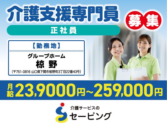 仕事内容 \ケアマネ経験不問!年間休日115日でゆとりある働き方/ 【下関市・グループホーム】資格があればOK! 介護業務と兼務で経験を積める。 月給23.9万円~+賞与3ヶ月!残業月平均4時間、託児所あり◎ 「家族のように」寄り添うケアを実践したい方を、74歳まで幅広く歓迎します。 <仕事内容> グループホーム「椋野」にて、施設ケアマネジャー(介護支援専門員)と介護職員を兼務する正社員の募集です。 資格を活かしつつ、認知症高齢者の方々と家族のように寄り添い、温かいケアを提供してください。 主な業務は、以下の通りです。 【施設ケアマネ業務】 当該施設に入居されている利用者様のケアプラン作成。 【介護業務】 日常生活全般の支援。 バイタルチェック、食事の支度・介助、入浴介助、服薬管理、掃除洗濯など。 当施設は、利用者様お一人おひとりと深く関わることを大切にしています。 現場の介護業務を通じて利用者様の状況を把握し、より実態に即した質の高いケアプラン作成ができるのが、この仕事の魅力です。 <おすすめポイント> ◎賞与実績3ヶ月分!安定収入を実現 基本給に加え、資格手当5万円などが支給され、頑張りにしっかり報います。 ◎年間休日115日!プライベート充実 月ごとに作成される勤務表によりますが、業界でもゆとりのある休日数です。 ◎ケアマネの実務経験は問いません! 資格をお持ちであれば、ブランクのある方や資格取得後すぐの方も歓迎します。 ◎夜勤は希望制(月平均5回程度まで可) 生活リズムを考慮でき、子育て中の方など、夜勤の回数を調整したい方も安心です。 <求める人材> ・介護支援専門員(ケアマネジャー)の資格をお持ちの方(必須) ・経験年数やブランクは問わず、新たな挑戦をしたい方 ・認知症ケアに熱意を持ち、利用者様へ温かく寄り添える方 ・チームワークを大切に、介護業務も積極的に行える方 ・年間休日や託児所制度を利用し、仕事と家庭を両立したい方 【応募をお考えの方へ】 株式会社セービングは、「人に寄り添う介護」を大切に、働く職員の夢と笑顔を支える会社です。 当グループホームでのケアマネジャーは、ケアプラン作成という専門的な業務と、温かい介護業務を両立することで、利用者様と深く関わることができます。 「資格はあるけれど経験がない」「キャリアチェンジしたい」という方も、資格手当や賞与3ヶ月分という好待遇、そして年間休日115日という働きやすい環境で、安心してスタートを切ることができます。 夜勤は希望制で、託児所の利用も可能。あなたの生活スタイルに合わせ、長く安定して活躍できる環境です。 皆様からのご応募を心よりお待ちしております。 ホームページ: https://e-saving.jp/
