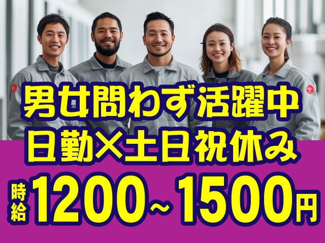 仕事内容 <日勤のみ!土日祝休み! 生活リズム安定の製造ワーク> みどり市エリアで、月収20万円以上が目指せる組立・検査のお仕事です。 //// おすすめPOINT //// ◆日勤専属(夜勤なしで安定) ◆土日祝休み(プライベート充実) ◆未経験OK! 経験不問のカンタン作業 ◆空調完備で年中快適 ◆週払い・前払いOK(急な出費も安心) 【具体的なお仕事内容】 工場内で、エアコンや冷蔵庫に使われる部品の組立・検査をお任せします。 1.部品のセット 両手サイズの金属部品を、機械や治具(型)にカチッとはめる 2.部品の組立 ドライバーや工具でネジを数か所締める(複雑な配線なし) 3.検査 完成した部品にキズや歪みがないかを目視でチェック 仕事のコツ 〇組立作業はマニュアルを見ながら行います。未経験でも数日で慣れる、「コツコツ・モクモク」と集中できる作業です。 〇一人で黙々と進める工程がほとんどなので、人付き合いが苦手な方も安心です。 【勤務時間と給与】 日勤のみ:8:00~17:00 時給1,200円〜 + 残業代は全額支給(時給1,500円) 残業は少なめですが、希望に応じて残業に入ることで月収21万円以上も可能です。 【職場環境の魅力】 〇空調完備で、夏場も快適に作業ができます。 〇無料駐車場完備、最寄りのJR岩宿駅からもアクセス良好。 〇食堂施設あり(食事代は給与控除で楽ちん)。 〇20代から50代の幅広い年代の男性・女性スタッフが活躍中です。 <応募からの対応もしっかり> 出張面接あり、WEB面接OK! ご応募頂きましたら、担当者よりご連絡いたします! しっかりとサポートしますので安心してご応募ください!