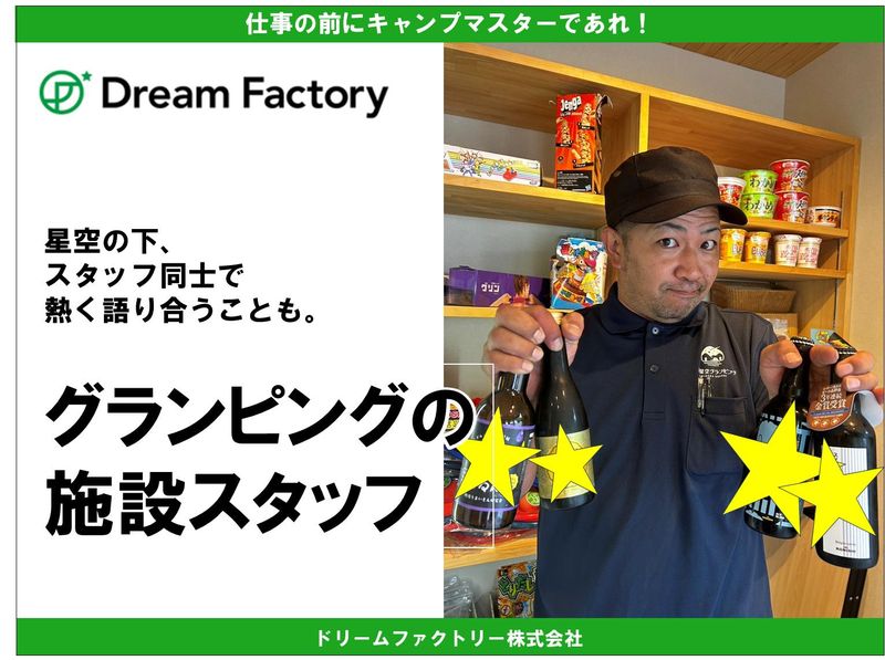 仕事内容 2023年8月にオープンした「丹波星空グランピング」は、 多くのお客様に支えられ、 丹波市でも人気の施設へと成長しました。 現在は2店舗目への挑戦や農業事業への展開など、 新たな可能性にもチャレンジしています。 これから迎える繁忙期に向けて、 一緒に施設を支えてくださる仲間を募集いたします。 【具体的な業務内容】 グランピング施設の運営スタッフとして、 お客様の滞在全体を支える業務を 担当していただきます。 チェックインからご滞在中のサポート、 清掃、翌日の受け入れ準備まで、 施設運営に関わる業務全般をチームで行います。 ・チェックイン/チェックアウト対応 ・施設案内、お客様対応 ・食事準備、提供サポート ・焚火サポート、アクティビティ案内 ・客室清掃、ベッドメイキング ・備品補充、共用部清掃 ・翌日受け入れ準備 ・予約管理補助 など ■シフト時間帯による業務の違いについて 当施設では、 勤務時間帯により担当業務が異なります。 【10:00〜15:00などの短時間・日中シフトの場合】 主に清掃業務、ベッドメイキング、 備品補充、BBQ準備、翌日の受け入れ準備など、 施設を整える業務が中心となります。 ※焚火対応やアクティビティ補助は基本的に含まれません。 【15:00以降のシフトの場合】 チェックイン対応、施設案内、 夕食提供、焚火案内、アクティビティ案内など、 お客様対応業務が中心となります。 【早朝シフトの場合】 朝食片付け、チェックアウト対応、 清掃準備補助などを担当していただきます。 勤務時間帯により、 関わる業務や体験の幅が変わります。 面接時にご希望を伺いながら、 適性や施設状況に応じて役割を決定いたします。 ■当施設の特徴 ・2023年8月オープンのグランピング施設 ・自然豊かなロケーション ・満天の星空が広がる環境 ・地域に根ざした運営を行っています 心地よい山あいの青垣から 多可町へ抜ける国道427号沿いに位置し、 ファミリーやご友人同士で ご利用いただくことの多い施設です。 ■ この仕事の特徴 ・お客様と直接関わる機会が多い ・チームで連携して動く仕事 ・立ち仕事が中心 ・屋外業務あり(天候の影響あり) ・繁忙期は忙しい ※楽な仕事ではありませんが、その分やりがいのある仕事です。