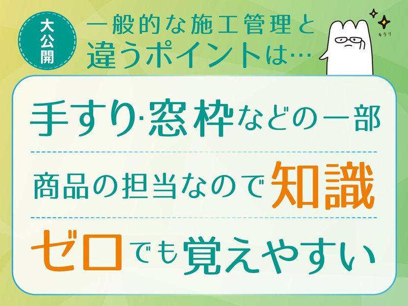 仕事内容 ✅向いているYES・NO診断! 【Q】安定企業で働きたい 【Q】「一か所でずっと仕事をするのが苦手」なあなたへ 【Q】「飾らないで働きたい」のあなたへ 【Q】未経験からReスタートしたい YESが多いほど、この仕事はあなた向きです♪その理由をご紹介します! ✅「安定企業で働きたい」あなたへ 東証プライム上場「三協立山株式会社」の正規代理店。マンションのリニューアル事業で黒字経営を継続中! …――――――… 具体的な仕事内容 …――――――… 窓枠や玄関ドア、手すりなどを取り付けるスケジュール管理をお任せ! 【1】リニューアルする 集合住宅の調査を実施 ※窓枠やドアの寸法を測ったり状況確認 【2】顧客要望を踏まえて事前準備 リフォーム工事の内容を確認 【3】材料発注や職人さんのスケジュール管理・手配 【4】工事の内容に間違いがないか図面の確認 【5】スケジュール計画の打合せ 【6】スケジュール管理と品質チェック 【7】納品 ✅「一か所でずっと仕事をするのが苦手」なあなたへ 案件ごとに勤務エリアが異なります。都内、神奈川、千葉エリアがメインで、「家のエリアを踏まえて現場を決定」します! ※直行直帰OK ※転勤なし ✅「飾らないで働きたい」のあなたへ お客様から人で選ばれている会社です☆裏表がなくて、なんだかんだで真面目で、ありのままの飾らない子が当社ではちゃんと評価される人材です! ✅「未経験からReスタートしたい」あなたへ AD、アパレル、ホテル接客、バーテンダー、事務職など異業種出身者が活躍中! ~安心サポート~ 経験豊富な社内外メンバーがフォロー。「わからないことない?」「お疲れさま、お茶いる?」と気軽に声をかけ合う雰囲気です♪協力会社とも長年の信頼関係があり、協力会社さんというより同じ会社の一員くらいの間柄です。 ~入社後の流れ~ 先輩に同行しながら、寸法の測り方など基礎から少しずつスタート。あなたのペースに合わせて仕事をお任せします!