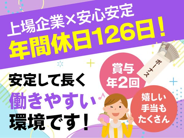 休日休暇 年間休日126日 ※配属先に関わらず、年間休日が126日です。 ・完全週休2日制(土日) ・祝日 ・GW、夏季、年末年始 ・特別休暇(慶弔、出産、災害、運転免許更新など) ・有給休暇(10日)▶前年度取得率85.7% 半日有給休暇あり ・育児、介護休暇