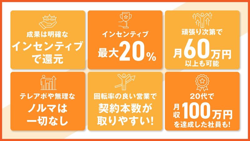 求めている人材 ✨こんな方にピッタリ✨ ✅人と話すのが好きな方 ✅外回りや行動的な仕事に抵抗がない方 ✅頑張りを正当に評価されたい方 ✅向上心があり新しいことに挑戦したい方 ✅自分の市場価値を高め、 どこでも通用するスキルを身につけたい方 ✅分業制の営業に物足りなさを感じている方 ━━━━━━━━━━━━━━━━━━━━━━━━━━━━━ ✨社員の約7割が中途入社✨ 様々なバックグラウンドを持つメンバーが活躍しており、 途中から入ってもすぐに馴染めるフラットな社風です。 ━━━━━━━━━━━━━━━━━━━━━━━━━━━━━ ✨活かせる経験✨ 不動産営業、ハウスメーカー営業、自動車ディーラー、保険営業、 商社、美容部員、アパレル販売員、飲食店スタッフetc. 異業種からの転職者が多数活躍中! ━━━━━━━━━━━━━━━━━━━━━━━━━━━━━