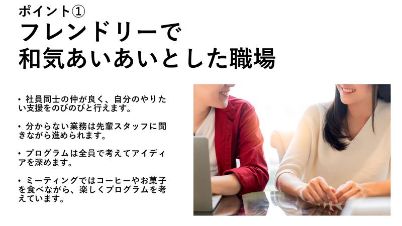 アピールポイント: 〇事業所の想い・特徴 私たちは、親御さんの悩みに寄り添い、 子どもたちの「居場所となる」支援を大切にしています。 職員同士の関係が良く、相談しやすい雰囲気の中で、 一人ひとりの支援をチームで考える事業所です。 「子どもが好き」その気持ちがあれば大丈夫。 経験よりも、人柄や想いを大切にしています。 〇職場の魅力 ✔ 有給取得率100% ✔ 残業代全額支給 ✔ 未経験から資格取得まで会社がサポート ✔ 1on1面談で悩み相談OK ✔ ミーティングは和やかな雰囲気 ✔ プログラムは全員で考えるスタイル 人間関係の良さと働きやすさに自信があります。