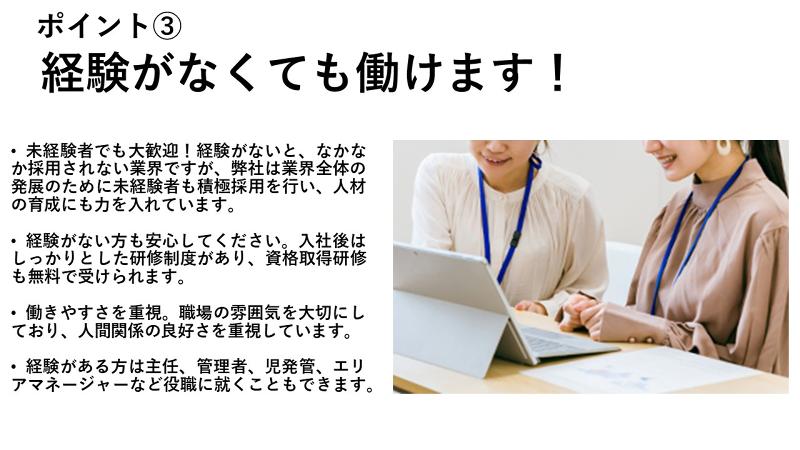 求める人材: 〇こんな方を歓迎します * 子どもが好きな方 * 福祉に興味がある方 * チームで働くのが好きな方 * 未経験でもチャレンジしてみたい方 見学のみも歓迎です。 職場の雰囲気をぜひ感じてみてください。 あなたと一緒に働ける日を楽しみにしています。