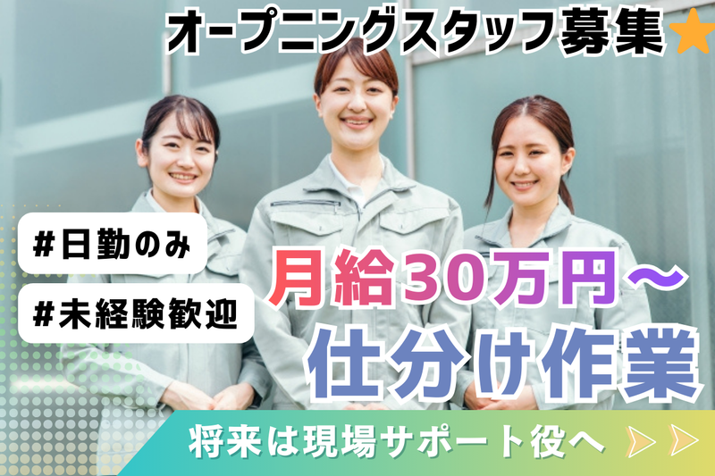 仕事内容 <仕事内容> 簡単な廃棄物の仕分け作業からスタートします。 ルーティン化されたシンプル作業なので、 未経験の方でもすぐに慣れていただけます◎ オープニング募集のため、 新しい環境で一緒にスタートできます。 まずは基本的な仕分け作業を中心に、 慣れてきたら―― ・作業の進行サポート ・スタッフへの声かけ、指示出し など、現場をまとめる役割も少しずつお任せしていきます。 ▶ 将来的には、現場リーダー候補として 活躍していただける方を募集しています。 ※在籍スタッフのフォローや調整など、 細やかな気配りが活かせるポジションです。 (女性スタッフも活躍しやすい環境◎) ▶ 未経験・ブランクOK 最初は基本的な流れから、 一つひとつ丁寧にお教えします。 未経験の方・ブランクがある方も 安心してスタートできます! ★ここがPOINT★ ▶ 月給30万円スタート!安定収入◎ ▶ 日勤のみ/生活リズム安定 ▶ 車通勤OK(無料駐車場あり) ▶ 制服貸与/食堂あり/交通費支給(規定)