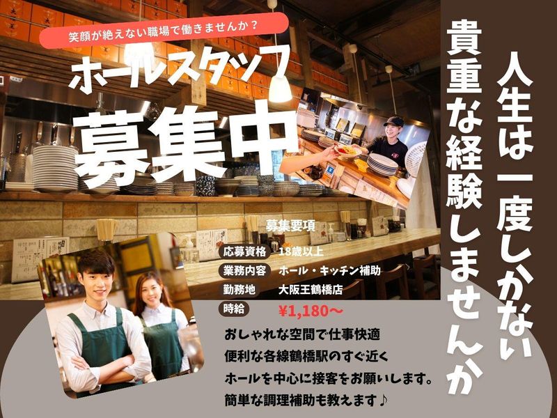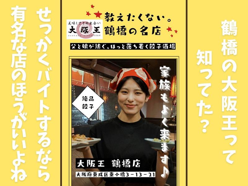 仕事内容 \ 地元の人に愛される! / おいしい餃子が人気なお店です! 来年で卒業する仲間がいる為、人材募集します! 夜は学生中心で近大生が特に多いのが特徴! お客様は20台女性が中心の明るい職場です! 【 ホールスタッフ 】 ・オーダー取りや接客 ・料理、ドリンクの提供 ・テーブルの片づけ など ホール業務全般をメインにお願いします! ステップアップで簡単なキッチン補助もお任せ! \オススメPOINT/ ・1日3h~ok!柔軟なシフト ・時短勤務ok!家庭との両立、平日のみも可 ・賄い制度あり*食費節約にも。 ・20代・30代・40代の学生や主婦さんが多数活躍中!