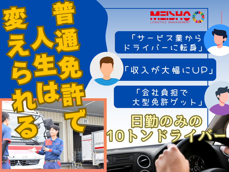 仕事内容 毎日、笑顔で接客してるけど、 心の中では「この先、ずっとこのまま?」と 不安になることがある。 でも、特別な資格もスキルもない自分に、 選べる道なんて他にあるのかな… そんなあなたに新しい選択肢を! 名正運輸では、 「普通免許」からスタートして 大型ドライバーを目指すことができます。 「え?いきなり無理でしょ」 そう思ったあなたにも 一歩ずつステップアップできたら どうでしょうか? 必要な免許は会社が全額負担。 自費ゼロで教習所に通えます。 免許取得中も倉庫作業などで 収入を得られて安心。 普通→中型→大型と ステップアップも可能です! しかも… ✅賞与年3回!給与もベースアップ! ✅子ども一人につき手当1万円 ✅ドライバー全員年次昇給あり ✅日勤のみで完全週休2日制 <仕事内容> 大型(10t)トラックで 担当するお客様の店舗やスーパーへ 食品や飲料の配送をお任せします! ※基本的に配送ルートやパターンは同じです! ※長距離運転やノルマなどはありません! <具体的な商品は?> 調味料 ペットボトル飲料 レトルト食品 お菓子 など 馴染みのある食品ばかりです! <お届け先は?> スーパー・ドラッグストアなどの各店舗 一般家庭の配送は無いので、 再配達もありません! <ほどよい距離感がちょうどいい> お届け先は店舗やセンターで、 接客業ほどの会話はなし 社内もつかず離れずの関係性。 雑談する時もあれば、 淡々と始まって終わる日も! <運転も仕事も段階的にサポート> \最長2カ月間の研修からスタート!/ <1>トラックの乗り降りの方法や 荷物の積込み方法など、 カンタンな仕事から教えていきます! <2>先輩が運転するトラックの 助手席に乗り仕事の流れや 道順などを覚えましょう。 <3>ある程度覚えたら、 いよいよ運転へ! 今度は、先輩が助手席で あなたの運転をサポートします。 ※この間に、業務に必要な免許も 取得できます! <手厚い手当で収入アップ!> 子ども手当(1人あたり月1万円) 健康手当(月1万円/非喫煙者) 安全手当(月1万円/無事故・無違反) プロドライバー手当を新設! ◎皆が長く続けられるよう 年々改善しています <働き方も、日勤で安心> 勤務時間は朝5時~20時の間で8時間固定 例1)5:00~14:00(休憩1時間) 例2)8:00~17:00(休憩1時間) 例3)11:00~20:00(休憩1時間) 完全週休2日制で、 毎週しっかりリフレッシュ 夜勤や長時間拘束もないから、 生活リズムも安定します! ・‥…━━━・‥…━━━ 【会社の雰囲気】 20代/30代/40代を中心に 幅広い年齢の先輩が活躍中! 穏やかで優しい社員が多いので、 安心して働ける居心地の良さがあります! 元サービス業など異業種出身の先輩も多数!