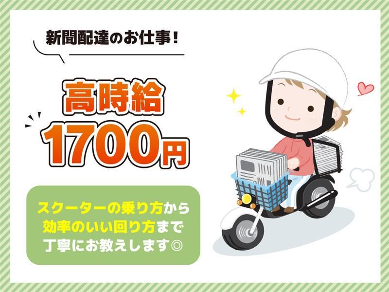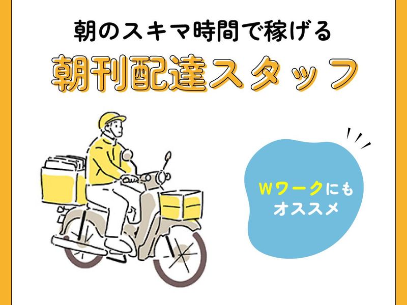 仕事内容 \朝の短時間でシッカリ稼ぐ/ ◎1日1h~OK!出勤時間も相談可 ◎1日1.5h勤務で月収5万6250円可 ◎未経験から始めたスタッフも多数 ◎Wワーカー、学生、主婦さん活躍中 ◎勤続30年以上の69歳シニアも在籍 朝刊をお届けする新聞配達の仕事です。 原付き免許があれば未経験OK! バイクの乗り方からサポートします。 ※マイカーでの配達も可能です 配達先はリストでいつでも 確認できるのでご安心ください! 決まったお宅へのお届けなので すぐに見なくても 配達できるようになりますよ。 子育て中の主婦さん、 セカンドライフを楽しむシニアさん、 夢のために稼ぐWワーカーさんなど さまざまな方が活躍しています! ━━━━━━━━━━ スタッフの声 ━━━V━━━━━━ (20代学生さん) 学校に行く前の朝の時間に ちょこっと働いています! 1時間だけの勤務ですが、 高時給だから効率よく 稼げるのが嬉しいです* (30代主婦さん) 主人が仕事に出かける前の 朝に時間に働けるから 子どもに負担をかけないで いいのが嬉しいポイント! 時間も短いので私も 無理なく働けています。