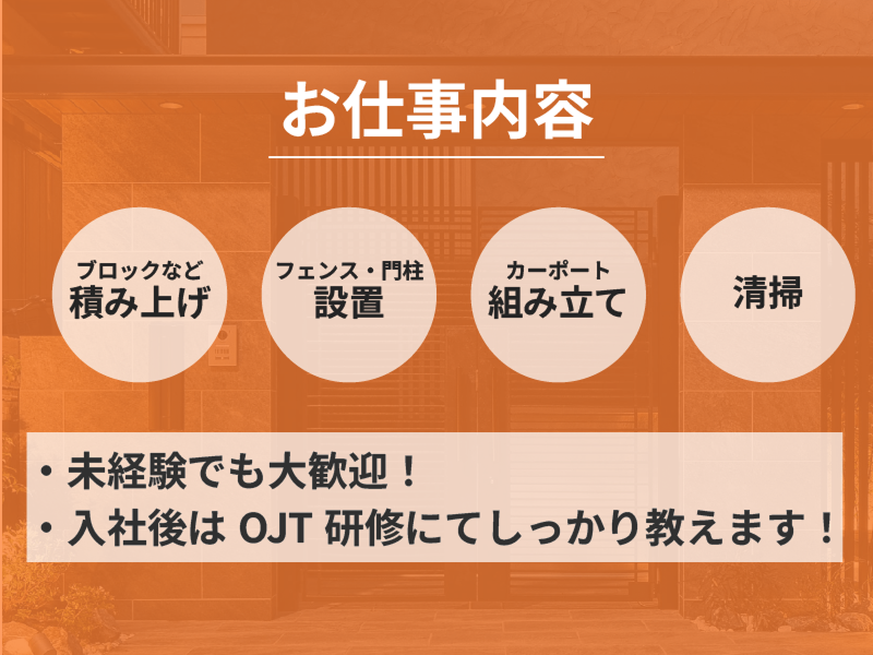 アピールポイント: ーーーーーーーーーーーーーーー ・20〜30代が活躍中! ・キャリアアップ可能な環境! ・福利厚生充実! ・転勤なし! ・資格取得支援あり! ・長期休暇でリフレッシュ可! ・八王子市、町田市、日野市、相模原市緑区、相模原市中央区、相模原市南区からの通勤者多数! ・男性、女性共に産休育休実績あり ーーーーーーーーーーーーーーー 【当社について】 当社は東京都・神奈川県を中心に、年間2,000棟以上の住宅外構・エクステリア工事を施工する総合建設企業です。 外構・基礎・土木・タイル・リフォーム・不動産まで幅広く事業展開しています。 ーーーーーーーーーーーーーーー 【フロンティア建設で働く魅力】 ① 自分の力を試せる環境 ② お客様に直接喜んでもらえるやりがい ③ 何もないところから形にしていくモノづくりの楽しさ ーーーーーーーーーーーーーーー 【将来のキャリア】 ・事業部責任者や幹部を目指す ・新規事業を立ち上げる → 社内ベンチャー制度あり!会社が全面的にサポートします。 ーーーーーーーーーーーーーーー