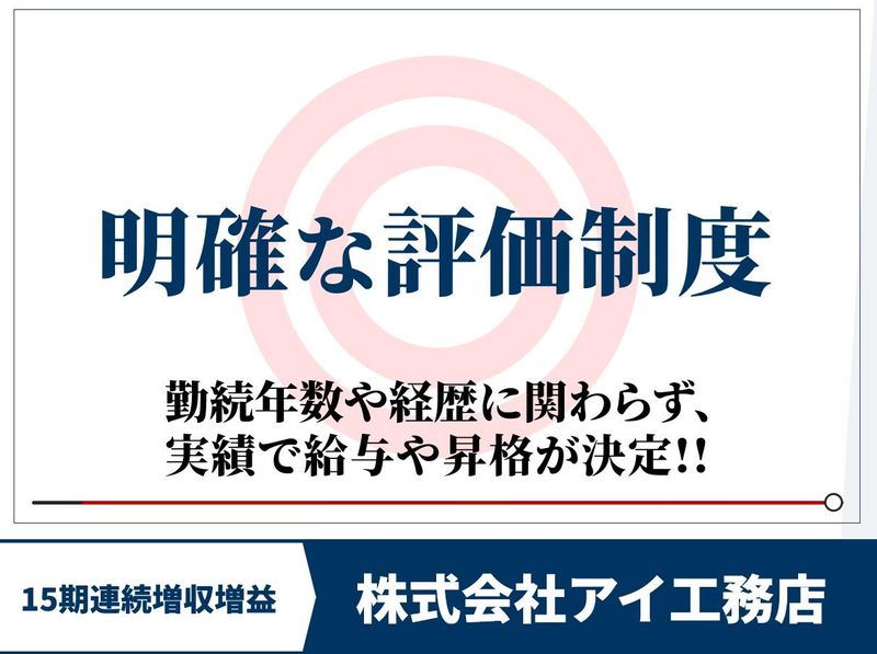 仕事内容 ++・・・・・・・・・・・・・・・・++ 注文住宅・ハウスメーカー営業経験の スキルを最大に活かせるアイ工務店 ++・・・・・・・・・・・・・・・・++ 【仕事内容】  ̄ ̄ ̄ ̄ ̄ ̄ ̄ ̄ ̄ ̄ ̄ ̄ ̄ ̄ ̄ ̄ ̄ ̄ 木造注文住宅の企画・提案をお任せします。 わたしたちの仕事のスタイルは… ⏩100%反響営業 モデルルームに来場されたお客様や SNSやHPを見てお問い合わせいただいた お客様へのご案内となります。 100%反響営業(飛び込みなし)で、 月ごとの個人ノルマもありません。 ⏩一気通貫型 当社では営業・設計・積算を一人で担当する 「一気通貫型」の営業スタイルを 採用しています。 お客様への対応がスピーディになり、 契約に繋がりやすく、分業制では得られない 幅広いスキルも身につきます。 【中途入社者が実感する魅力】  ̄ ̄ ̄ ̄ ̄ ̄ ̄ ̄ ̄ ̄ ̄ ̄ ̄ ̄ ̄ ̄ ̄ ̄ 中途入社者の約7割が住宅業界経験者です。 経験者だからこそ実感する アイ工務店の魅力をご紹介します。 |◤明確な評価制度◢| 明確なルールに基づき、経歴や勤続年数に 関わらず、自身の頑張りがダイレクトに 給与に反映されます。 ◆売上棟数・金額で給与・役職を決定 ◆契約1件ごとにインセンティブを支給 半年間の引渡金額が一定を超えると インセンティブが【倍増】します。 ◆入社1~3年で営業所長へ昇進した実績多数 |◤高品質×適質価格の商品力◢| 「この品質でこの価格なら、売れて当然!」 と業界他社からの入社者も納得の 商品力があります。 ◆商品に自信あり! だからこそ1人あたり年間契約棟数が 業界平均3~4棟といわれているなか、 当社の平均は7棟、50%以上の営業が 年間7棟以上の契約をいただいております。 ※入社1年目の社員も含む |◤業界トップクラスの成長率◢| 2010年の設立以来、15期連続の増収増益を達成。 今なお成長を続ける、勢いのある会社です。 ◆売上高は2010億円に達しています。 ◆高い収益性(利益率10%超) ◆健全な財務体質(自己資本比率50%超) ◆全国300以上の拠点を展開。 ◆2026年6月末までに330拠点体制を 目指しています。 ◆事業拡大に伴い、管理職ポストも豊富にご用意! 実力次第で入社後数年での昇格も可能です。 |◤ワークライフバランスの実現◢| メリハリのある環境で、仕事と 私生活を両立。40代・50代が長く 活躍できる環境を整えています。 ◆完全週休2日制 ◆長期休暇あり (年末年始16日間の実績) ◆転勤なし(希望勤務地で活躍可能) ◆生産性向上の取り組み 不要な会議を削減し、営業管理の 自動化を推進 【中途入社者の声】  ̄ ̄ ̄ ̄ ̄ ̄ ̄ ̄ ̄ ̄ ̄ ̄ ̄ ̄ ̄ ̄ ̄ ̄ ✅前職:大手住宅メーカー営業(40代) 前職では、成果を出す・出さないに 関わらず、毎年昇給していくという 年功序列な制度でした。 当社には『係長』として入社。 『年間8棟』という明確な昇格基準を 2年連続でクリアし、『部長』に昇進。 年齢や社歴ではなく、成果を正当に 評価してくれる環境に満足しています。 ✅前職:地場工務店営業(30代) 前職では分業制のため、お客様の希望の スケジュールに沿った提案ができませんでした。 アイ工務店では自分のペースでプラン作成や 見積り提案などスケジュールが調整しやすい ところにも満足しています。 給与も自分の頑張りを直接評価してもらえる システムなため、頑張りがいがあります。 休みの日についても自由に申し出ができ、 家族との時間も調整しやすいです。 子供の長期休みには様々なイベントがあり、 春や夏にBBQ、冬は豪華な会場を貸切った パーティーなども開催。 家族と一緒に参加できるイベントもあり、 毎年家族も楽しみにしてくれています。 ✅前職:ハウスメーカー営業(30代) 前の会社では契約を取ってもすぐに給料が 上がる事はなく、毎年少しずつ上がっていく 給与形態でした。 アイ工務店では自分が頑張った分だけ 給料に反映され、頑張れば20代、30代でも 稼ぐことができます。 実際に自身も、入社してから給料が増え、 生活水準が上がったと実感しています。 また社員旅行が年に1度あり、 初めての海外旅行も経験できました。 給与形態はもちろん、それ以外でも 仕事をまた頑張ろうと思えるような 環境があると感じています。