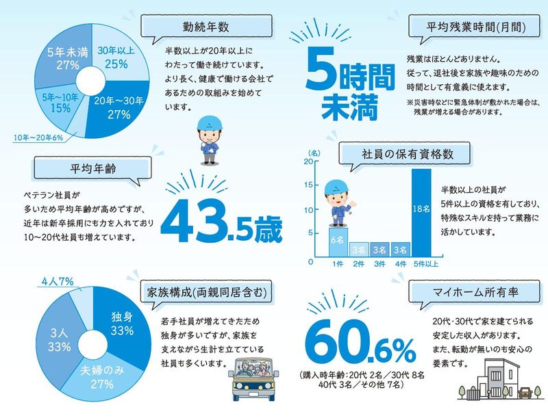 職場環境 社員の負担軽減と健康増進のため「健康経営優良法人」の認定を受け、社員や家族などから安心して長く働ける職場を目指し、ワークライフバランスの推進にも努めております。 喫煙所:喫煙所あり(屋外) 喫煙専用室設置(喫煙可能区域での業務なし)
