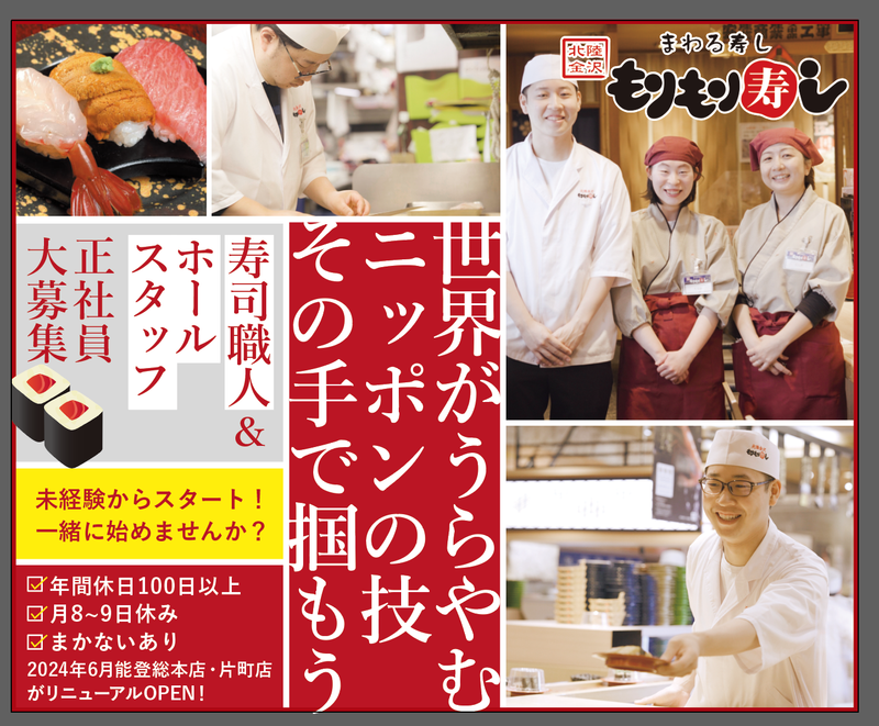 仕事内容 ◇学校や家事の空き時間に短時間で働きたい ◇接客は苦手。もくもくと作業できるバックヤードで働きたい そんな思いをお持ちの方はぜひ当社の求人にご応募ください! 【当社の求人のポイント】- ・1日3時間・週3日~OK!ライフスタイルに合わせてシフトを調整できます! ・すし皿洗いマシーンを使用しているので洗い場作業は簡単です! ・食費が浮く!まかないは「ごはん・味噌汁無料」&「店内商品半額」 - ・・・・・ 仕事内容 ・・・・・ 厨房でお客様からご注文のあった丼物や汁物、椀物やお寿司の調理補助・盛付けなどをお任せします。また、食器洗浄などの洗い場業務もお願いします。 具体的には、一品料理や味噌汁を調理して提供したり、ドリンクを準備したりしていただきます。包丁を使う作業はありません◎盛付け方や調理法などはマニュアルがあるので、調理経験がない方もご安心ください。 食器洗いはすし皿洗浄マシーンや業務用食洗器を使用しており、食器をセットするだけの簡単作業です! 寿司ネタの種類が分からなかったり調理の知識がない方、未経験の方もまずは先輩スタッフがついて丁寧に指導します。スタッフ同士の連携を大切にした店舗づくりを行なっているので、サポート体制はばっちり!はじめてのアルバイト、飲食店未経験の方でもご安心ください! アピールポイント: - 当社のこだわりについて - 1991年に石川で創業した当社。「お客様満足」を第一に、味にこだわり、創業当時の30年前とほとんど原料を変えていません。原料のコストが上がっても、値上げしながら、同じものを使い続けることにこだわってきた結果、お客様にいつ来ても「同じ美味しい味」を提供できるお店であり続けることができています。現在では、その思いがお客様からの支持につながり、石川だけではなく東京・埼玉・神奈川・山梨・愛知・大阪・兵庫・奈良・滋賀に出店をしています。 - 当社の特徴について - 飲食事業の他にも「不動産事業」や「太陽光事業」、「金融投資事業」など、多岐にわたる事業を展開しています。安定した経営基盤のもとで、長期間にわたって安心して働くことができ、新たなチャレンジや成長の機会が広がっています。 - 目指すは「日本一お客さま満足度の高い寿司店」 代表取締役社長 上野謹一 - 元々能登の田舎で育った私は、子どものころから地元の人たちの義理人情を大切にする思いや行動を見てきたんです。だからこそ、いろいろなお店も経験しましたが、1番作りたいと思ったのは「日本一お客さま満足度の高いお店」でした。 この30年、一生懸命頑張ってくれる真面目な社員と一緒に頑張ってきて、石川だけではなく県外にも店舗を拡大してきたからこそ、今後は店舗拡大よりも、従業員の皆さんが安心して長く勤めていただける会社になるために、「従業員への利益還元」「成長を見守ること」に力を入れていきたいです。 私は働くうえで、会社や仕事が一番でなくとも良いと思っています。一番は家族や大切な人。そんな思いを持っている人と一緒に働けると嬉しいです。ご応募お待ちしています。 ▶さらに詳しい情報は採用サイトをご覧ください。「もりもり寿し 採用サイト」で検索!