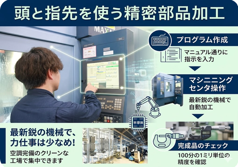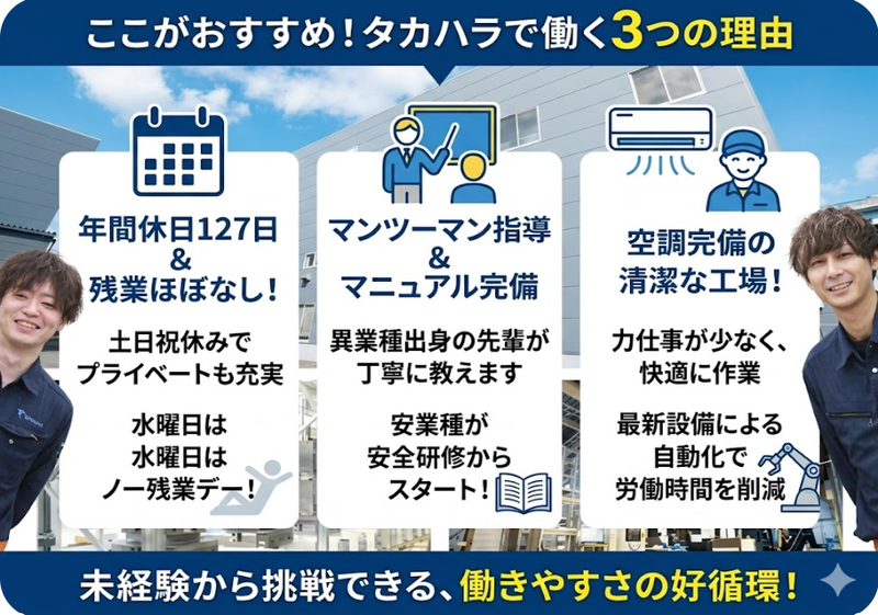 仕事内容 ╭━━━━✨ ここが全て! ✨━━━━╮ 最新設備による自動化で労働時間を削減! 年間休日127日・残業月10h以下を実現。 空調完備の快適な工場でモノづくりに挑戦! ╰━━━━━━━━━━━━━━━━━╯ ⭐ 具体的なお仕事内容  ̄ ̄V ̄ ̄ ̄ ̄ ̄ ̄ ̄ ̄ ̄ ̄ ̄ ̄ ̄ ̄ ̄ ̄ ̄ スマートフォンや家電など、 身近な製品に欠かせない「半導体」。 その製造装置に使われる精密機械部品の 加工作業をお任せします。 ✅プログラムを作成して機械に指示を出す ✅マシニングセンタ(工作機械)の操作 ✅完成した部品のチェック 最新鋭の機械を使用するため、 力仕事は少なく、頭と指先を使う作業です。 ⭐ 未経験でも安心の教育体制  ̄ ̄V ̄ ̄ ̄ ̄ ̄ ̄ ̄ ̄ ̄ ̄ ̄ ̄ ̄ ̄ ̄ ̄ ̄ 「機械の操作なんて難しそう…」 そんな心配は一切不要です! ✅入社後の流れ まずは安全研修からスタート。 その後、先輩社員がマンツーマンで付き、 機械の名称やボタンの役割から 丁寧にレクチャーします。 マニュアルも完備しているので、 自分のペースでじっくり覚えられます。 異業種(飲食業や大工など)から 転職した先輩も多数活躍中です! ⭐ 働きやすさの「好循環」  ̄ ̄V ̄ ̄ ̄ ̄ ̄ ̄ ̄ ̄ ̄ ̄ ̄ ̄ ̄ ̄ ̄ ̄ ̄ 当社はお客様の満足度を高めるため、 最新設備への投資を惜しみません。 機械の自動化・無人化が進むことで、 生産効率が劇的にアップ! その結果、社員の労働時間が削減され、 「基本土日祝休み」「水曜ノー残業デー」 「残業月平均10時間以下」を実現しています。 工場内はエアコン完備で通年快適です。 ───【当社について】─── 大手メーカー(川崎重工業様、ダイフク様等) との直接取引が多数あり、業績は絶好調。 会社を挙げて「残業時間ゼロ」を目標に掲げ、 16:50の定時退社を目指しています。 頑張りは賞与(昨年度実績4ヶ月分)や 昇給でしっかりと還元する社風です。 ■公式HP:https://www.takahala.co.jp/