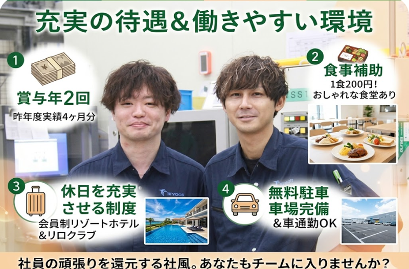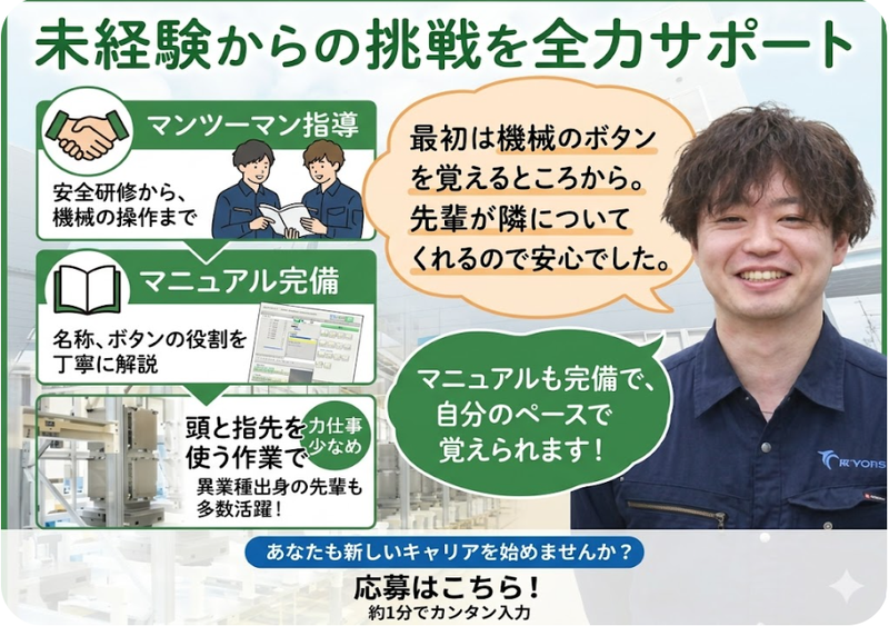 求めている人材 ⭐ 必須条件 ───────────── ✅ 高卒以上 ✅ 未経験・第二新卒大歓迎! ⭐ こんな方にピッタリ! ───────────── ✅ モノづくりや細かい作業が好きな方 ✅ 手に職をつけて長く安定して働きたい方 ✅ プライベートや家族との時間も大切にしたい方 ⭐ 歓迎スキル(なくても全く問題ありません) ───────────── ✅ マシニングセンタ等の操作経験 ✅ CADの使用経験 ✅ 製造現場でのオペレーター経験