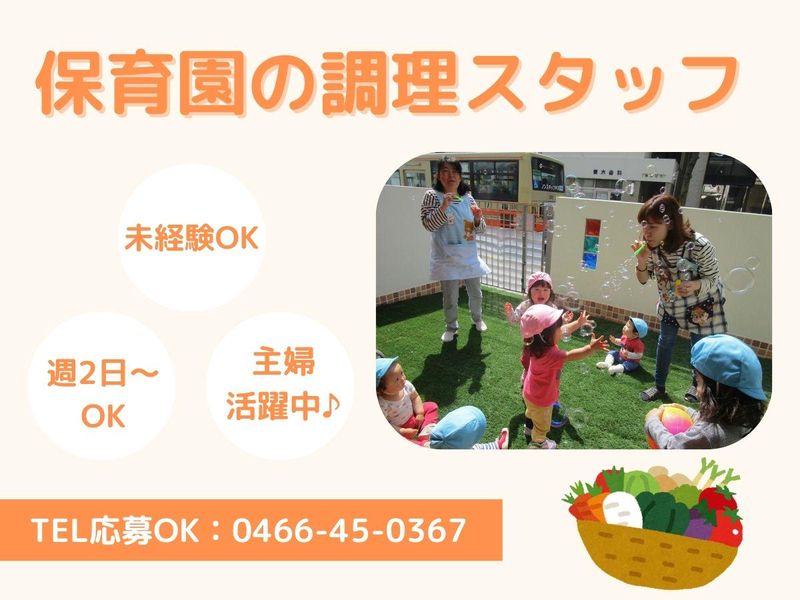 仕事内容 ✨新着求人✨ ◆―――――おすすめポイント――――◆ ⭐調理師or栄養士の資格あれば大歓迎♪ 調理経験ある方は大歓迎!! →資格お持ちであれば未経験OK ⭐藤沢駅北口より徒歩7分! ⭐タレントさん招いてのイベントもあり ⭐気になった方はWEB応募orお電話を! TEL:0466-45-0367 ◆―――――――――――――――――◆ <仕事内容> 保育園の給食調理をお任せします。 子どもたちに喜んでもらえるよう 美味しい料理を作ってください! 子どもが好きなスタッフさんが 多数在籍している職場です! ▼具体的には…▼ ✅給食調理 ✅離乳食・昼食の調理 ✅配膳 など。 調理以外でも覚えることや臨機応変に対応 しなければならない場面もありますが 常勤の栄養士がイチから丁寧に 指導しますので未経験の方や ブランクのある方もご安心ください✨ ✨コミュニケーションが重要✨ 仕事は1人で頑張るものではなく、 みんなで助け合いながら 進めていくものが多いです。 まわりと連携を取りながら、 「思いやりを持った行動」 を大切に考えています。 困ったときは助け合う風土が 自然と根付いています。 子どもたちが落ち着いた毎日を 過ごせるための環境づくりを目指して、 まわりと協力しながら給食調理に 取り組める方をお待ちしています✨ ✨当園の特色✨ 有名タレントによるイベント多数開催! 毎年、園行事とは別にタレントを お招きしてイベントを開催しています。 このイベントでは、職員の皆さんも 一緒に楽しんでもらう内容となっています。 ✨昨年実績✨ お笑いライブや有名アーティストに よるライブイベント、 某有名テレビ番組出演者による 工作教室やピアノ研修、 紙芝居師による紙芝居公園…など。