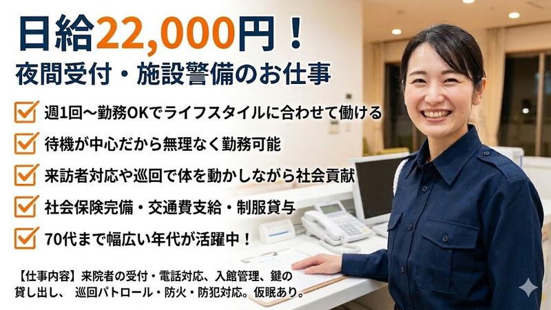 仕事内容 ✅ 日給22,000円! ✅ 週1回~勤務OKでライフスタイルに合わせて働ける ✅ 待機が中心だから無理なく勤務可能 ✅ 来訪者対応や巡回で体を動かしながら社会貢献 ✅ 社会保険完備・交通費支給・制服貸与 ✅ 未経験OK!70代まで幅広い年代が活躍中 ✅ 車通勤OK/休日は2名体制 【仕事内容】 休日勤務での施設受付および警備のお仕事です。 ・来院者の受付・電話対応 ・入館管理、鍵の貸し出し対応 ・施設内巡回 ・待機中の事務作業 勤務中は待機時間もあるので、体への負担も少なく安心です。 【こんな方にピッタリ!】 「安定した収入を得たい」 「体を動かしながら社会の役に立ちたい」 「未経験から新しい仕事に挑戦したい」 「責任感を持って働ける環境を探している」 生活を支えるだけでなく、“社会の安全を守るやりがい”を感じられる仕事です。 【1日の流れ(例)】 08:30 出勤・待機 12:00 来訪者対応・電話対応 17:00 施設内巡回 24:00 仮眠 05:00 巡回・見守り業務 08:30 退勤 【応募を考えている方へメッセージ】 当社は「人々の安全を守る」という社会的に大切な役割を担っています。 しっかりと休みも確保しながら働ける環境をご用意しています。 未経験の方でも安心してスタートできるよう、研修やサポート体制も整っています。 「安定した収入を得たい」「人や社会の役に立ちたい」という気持ちをお持ちの方であれば大歓迎です。 ぜひ、私たちと一緒に安心・安全を守る仲間として活躍しませんか? あなたのご応募を心よりお待ちしています。
