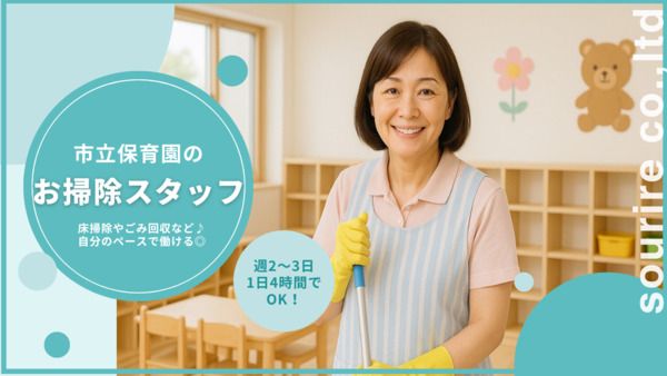 仕事内容 ◆◆ 尾張旭市立中部保育園で清掃のお仕事 ◆◆ 尾張旭駅近くにある中部保育園で園内のお掃除をお任せします♪ 清掃でのお仕事が初めての方もカンタンな業務となりますのでご安心ください! ✨主な仕事内容✨ ✅ほうきや掃除機、水拭きなどで園敷地内の床清掃 ✅トイレ掃除 ✅各部屋のごみ回収 ✅消耗品の補充 など 上記が主な内容となりますが詳しいことは面接やお問い合わせ時にしっかりとご説明いたします。 園内をきれいに保ち子どもたちが安心安全に過ごせるような環境を作るお仕事になります◎ 事前研修がありますので清掃業務が初めての方でも安心して始められます。 ▼ここがPOINT!▼ *週2~3日でOK! *一人で作業するのが得意な方(園内には子供たちの笑い声で溢れてます♪) *1日4時間の勤務 *難しい業務や危険なものは一切なし! *男女問わず、ミドル・シニア世代の方活躍中!