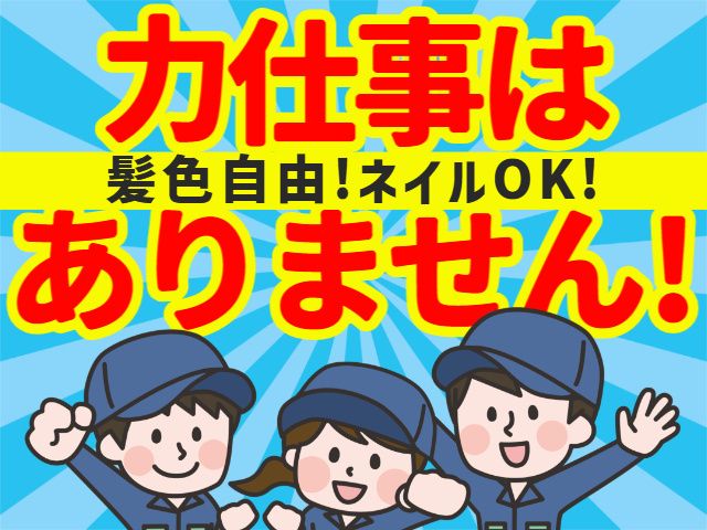 仕事内容 製造された製品の外観チェック作業です! 力仕事はないため体力に自信がない方にも おススメできます! <お仕事について> 製造された装置に不具合がないか チェックリストに従って、目視で確認する作業です。 例えば、前工程で作業した際に印をつけるため、 その印があるかどうかを確認になります。 力に自信がない方でも 安心して継続できる作業です。 <おススメポイント> ・日勤のお仕事 ・20代~50代の男性活躍中 ・週休二日制です <働きやすい環境です> 日勤専属で残業もほどよく月に20時間程度 土日祝はお休みのため予定も立てやすい! 残業なしでもOK! 髪色自由!髪色にこだわりがある方も そのまま就業できます! ネイルもOK! 少しでも興味が出た方はぜひお問い合わせ下さい。