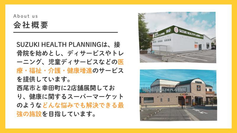 アピールポイント: ★社保完備+各種手当が充実 ★昇給・賞与の支給有り ★母体企業がしっかりしているため安心して長く働ける環境です。 ★毎週土・日休みのためプライベートも充実 【母体企業】 ~株式会社SUZUKI HEALTH PLANNING~ 接骨院・整体院・トレーニング・エステ デイサービス・訪問鍼灸などの各事業を運営しています。