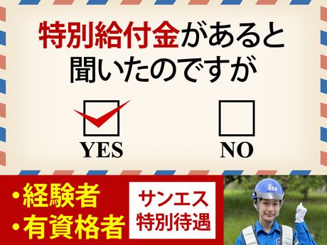 【保険制度】 雇用保険、労災保険、健康保険、厚生年金 待遇・福利厚生 【福利厚生】 ―― <充実の福利厚生> ―― ■面接交通費1000円(規定あり) └ 初回研修時、または給与にて支給 ■交通費全額支給 ■社会保険完備 ■資格手当あり ・交通誘導2級取得者:日給+500円 ・要資格現場への配属時:日給+1500円 ■ジョブペイ日払い(規定あり) ■サンエス警備保障特別給付金:10万円(規定あり) └ 交通誘導2級または指導教育責任者の資格をお持ちの方 ■制服貸与 *制服預り金1万5000円(退職時返金) 安全靴・合羽・キャップ支給(規定あり) ~~~~~~~~~~~~ *冬の防寒対策もばっちり♪ ヒーターベスト、ヒーター用バッテリー、防寒着支給! ココロも体もぽかぽかで安心してお仕事に集中できます ~~~~~~~~~~~~ ■資格取得制度 ■正社員登用制度 ■研修あり *資格なし、未経験者:研修20h 2万6250円 ※規定あり *経験1年以上(直近3年以内):研修7H ※規定あり └ 30勤務達成後に合計6万円支給 └ 交通誘導2級以上の資格を所持されている方は新任研修免除(現任研修はあり/6h) ■70歳以上は日給1000円減額
