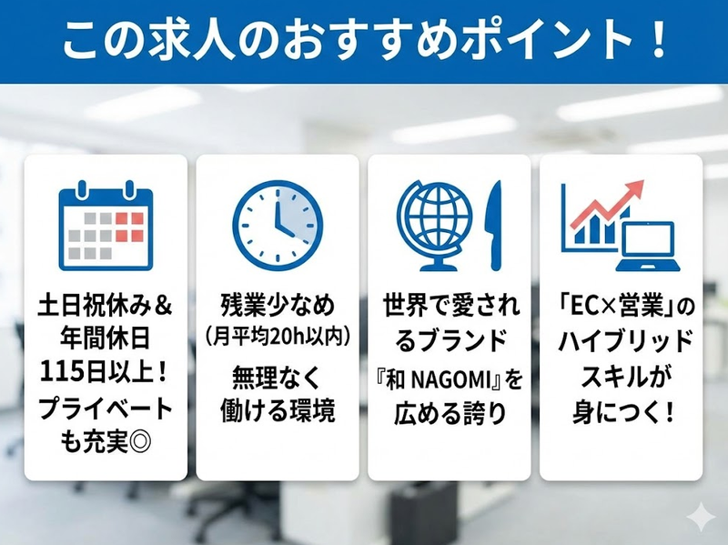 仕事内容 *‥‥*‥ アピールポイント ‥*‥‥* ✨【世界で愛されるブランドの営業】 『和 NAGOMI』など、明治 6 年創業の伝統技術が生んだ製品を世界へ広めるやりがい! 【未経験からマーケターへ】 この仕事は、単なる営業でもEC運営でもありません。 市場リサーチ・商品企画・価格設計・EC戦略・販促企画・在庫管理まで一貫して携われます。 若手でも企画提案可能。実際に、自身が企画した商品がECモールでランキング入賞する事例も! 積極的に挑戦できる環境が、当社にはあります。 ✨【働きやすさも抜群】 土日祝休み(年間休日 120日以上)で、プライベートも充実。 残業も月平均10時間程度! ✨【こんな方、大歓迎】 ブランドを育てる仕事がしたい…自分たちの商品をとことん愛せる方! 英語に強い方…海外とのやりとりであなたの語学力が活きる!(特に英語・中国語) 数字に強い方…在庫の最適化やAmazonセール対応など、あなたの「分析力」が活きる! 買い物・トレンド好きな方…市場でこんな商品が売れていそう!と興味がもてる方! *‥‥*‥‥*‥‥*‥‥*‥‥*‥‥* ┏────────────────┓ 老舗安定企業の正社員採用 土日祝休み&残業少なめ EC×メーカーの成長領域 ┗────────────────┛ ⭐具体的なお仕事  ̄ ̄V ̄ ̄ ̄ ̄ ̄ ̄ ̄ ̄ ̄ ̄ ̄ ̄ ̄ ̄ ̄ ̄ ̄ 創業 150 年以上の歴史を持つ刃物メーカーにて、 自社ブランド『和 NAGOMI』やキッチン用品の 「提案営業・EC企画営業」をお任せします。 新規・既存取引先への営業活動と販売の主戦場であるECサイトを活用し、売上最大化を目指す営業ポジションです。 ◆提案営業(ルート・反響) 既存の取引先(BtoB)への提案や、オンライン商談をお任せします。 飛び込みや厳しいノルマはなく、 チームに与えられた予算を達成するスタイルです。 ◆市場リサーチ・商品企画 トレンド分析・競合分析を行い、新商品を企画。既存ブランドの強化だけでなく、新ブランドの開発にも挑戦。 ◆EC戦略立案 社内のECチームと共に、Amazon・楽天などの販売戦略を設計し、“売れる仕組み”を構築します。 ◆在庫管理・受発注業務(重要!) Amazonセールや楽天スーパーセールなどの繁忙期に向けて、 在庫数の予測・管理、倉庫への発送準備を行います。「いつ・何が・どれくらい売れるか?」 を数字から読み解き、欠品や過剰在庫を防ぐなど重要な業務です。 ◆取引先・ECのお客様からのお問い合わせ対応・提案。 ⭐1日の流れ ─────────── 午前:受注データ確認、在庫・売れ筋のチェック。取引先・消費者への問い合わせ対応。 ▼ 午後:取引先とのオンライン商談。新商品の企画・立案。 ▼ 夕方: ECサイトの改善企画。出荷部隊への出荷指示と自ら出荷準備。 ※セール時は出荷関連業務が集中しますが、チームで協力して対応します! ⭐教育体制 ─────────── 入社後は、先輩社員が OJT で丁寧に指導します。 まずは自社商品『和 NAGOMI』の知識を深め、 先輩の営業同行やシステム操作からスタート。 営業未経験、EC 未経験の方でも、 マンツーマンでサポートするので早期に活躍できます! ⭐キャリアアップ ───────────── まずは主任を目指していただきます。 将来的には、営業部門のマネージャーや、新商品企画など、 あなたの意欲次第で多様なキャリアパスが描けます。 ⭐採用担当からメッセージ ───────────── 「ただ売るだけ」の営業ではありません。 自社ブランドの和 NAGOMIを自ら育て、成長していく過程を実感できる面白さがあります。 歴史ある企業ですが、社風はフラット。 あなたの「こうしたらもっと良くなる!こんなことを新たに挑戦したい!」 という積極的な姿勢やアイデアを待っています。 一緒に『和NAGOMI』を世界一のブランドに育てましょう!