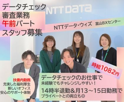 その他 未経験OK、大学生歓迎、フリーター歓迎、主婦・主夫歓迎、午前のみOK、短時間OK、長期歓迎、平日のみOK、週1、2日からOK、シフト制、賞与あり、交通費支給、社員登用あり、資格取得支援、時給1000円以上、PCスキルを活かせる・身に付く、車・バイク通勤OK、服装自由、髪型自由、友達と応募OK、駅チカ・駅ナカ 【研修】<入社日> 入社日:2/12(木) <研修期間> 入社日研修:10:00~14:30(実働4.5h/小休憩あり) 座学・OJT研修期間:約2週間程度 【事業所名】NTTデータ・ウィズ 【事業所住所】富山県富山市総曲輪1丁目7-15 日本生命富山総曲輪ビル2F 【出勤場所について】事業所所在地と同じ 【ブランド名】 NTTデータ・ウィズ 【事業内容】 ビジネスプロセスサービス事業/コーポレートスタッフ向けシェアードサービス事業