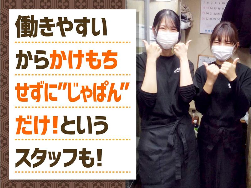 仕事内容 ✅髪色自由・ネイルok<お洒落に制限かけずに働ける> ✅給与手渡し<毎月25日締め、末日払い> ✅アットホームだから、かけもちせず 「じゃぱんだけ」で働くstaffばかり! ✅幅広い年代活躍中!<wワーク社会人の方も在籍> ┈┈┈┈┈┈┈┈ ▼お仕事内容 ┈┈┈┈┈┈┈┈ 席へのご案内、オーダー確認、 配膳・ドリンク作り・会計・洗い物など ホール専属のお仕事なので 「接客が好き」 「お客さんの楽しい雰囲気を近くで感じたい」 「調理系は苦手だけど笑顔で接客は得意」な方には 楽しんで働いてもらえると思います。 ┈┈┈┈┈┈┈┈┈┈┈┈ ▼お店・スタッフについて ┈┈┈┈┈┈┈┈┈┈┈┈ ◆プリプリのえび天ぷら、くじら串カツ、牛たたき など和食中心の居酒屋さんです。(全36席) ◆常連さん&スタッフも優しい人ばかリで とってもアットホーム! ◆現在スタッフは20代~40代の5名在籍☆ 大学生さんや社会人Wワークの方、 20代正社員の方など色んなスタッフがいます◎ ◆ホール2名、キッチン2名、 店長含めて計4名で日々営業してます。 まずは元気に挨拶できれば大丈夫! メニューや仕事の流れは少しずつ覚えていって下さい◎ 「初めてのバイト・パートだけど、私馴染めるかな~」 って不安に思わなくて大丈夫です! 入ってスグに忙しい週末にシフトを 入れたりはしないので安心してください◎