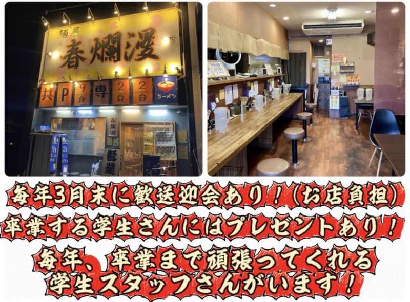 仕事内容 店長「働いてるとお腹空くと思ってさ!」 坊主頭の見た目はコワモテな店長から繰り出される心遣いにより、 シフトに入ると必ずおやつと飲み物をいただけます☆ まかないのラーメンは無料でトッピングも自由! 「いやダイエット中なんで…」なスタッフは、卵だけもらってました(笑) のびのび自由に働けるラーメン屋さんでバイトしてみませんか? ★春爛漫のココがのびのびポイント★ ―…―…―…―…―…―…―…―…― 【1】定着率◎働きやすい環境です! 難しい業務ナシ!&とにかく気遣い屋さんの店長なので、 居心地がよすぎると評判です(笑) 「大学の4年間ずっとバイトしてた」という卒業生も多数! 【2】1時間ごとに一休み♪絶対に無理はさせません! 立ちっぱなし、動きっぱなしにならないように、 およそ1時間ごとに5分間、休息をとってもらっています。 この5分間の分給料から引かれる…なんてことはありませんのでご安心を! 【3】オシャレ自由☆諦めなくてOK!! 髪型、髪色、ネイルにピアスも基本自由! 明るめの髪色で働く方や、毎月のネイルを楽しんでいる方も◎ 新作ネイルの話題でスタッフ同士盛り上がってます♪ ★ お仕事について ★ ―…―…―…―…―…― ラーメンの配膳や、テーブルの片付けなどをお願いします。 どちらもワゴン車を使用できるのでラクラク! 食券制なのでレジ業務やメニューの暗記は不要です♪ 未経験さんやバイトデビューさんも安心して働ける環境ですよ◎ ★ お店について ★ ―…―…―…―…―… カウンター5席、テーブル8席の小さなお店です。 勝川駅から徒歩6分!19号線若草町1丁目交差点のすぐ近くにあります! お客様を大切にするのはもちろんのこと、 スタッフも長く続けられる環境づくりを心掛けています◎