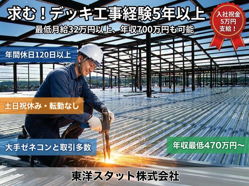 仕事内容 ⭐️この求人のアピールポイント⭐️ ✅️ 年収470万円~700万円!経験を正当に評価する給与体系 ✅️ 年間休日120日(有給消化で125日)×残業月5時間程度でワークライフバランス◎ ✅️ 大林組・清水建設・大成建設・竹中工務店など大手ゼネコンとの取引実績 ✅️ 採用時支度金5万円+誕生日祝金1万円など充実の福利厚生 ✅️ 創業40年×売上10.4億円の安定企業で長期キャリア形成 ✅️ 会社負担で資格取得支援+自社教育システム「TOYO HRD NEXT」で計画的に成長 📋仕事内容 建設現場にて鋼製デッキプレート(床版)の敷設・固定、スタッド溶接、フレアー溶接などの専門技術を駆使し、建物の床構造を支える重要な役割を担う技術職 建物の床の強度と耐震性を確保する重要な役割を担い、アーク溶接やスタッド溶接、フレアー溶接などの特殊溶接技術を駆使して、安全で強固な床構造を作り上げます。 デッキ工事経験者はリーダーとして活躍いただき、将来的にはスタッド溶接の資格取得も目指せます。 <具体的な業務内容> ■デッキプレート施工業務(メイン) ✅️ 建設現場(建築・橋梁・プラント等)でのデッキプレート敷設作業 ✅️ デッキプレートの固定・溶接作業 ✅️ スタッド溶接・フレアー溶接 ✅️ 施工図面の確認・墨出し作業 ■専門溶接・補強業務 ✅️ 橋梁メンテナンス作業(既存構造物の補強・補修) ✅️ 杭頭補強筋溶接工事(半自動溶接) ✅️ 玉掛け作業による資材の吊り上げ・運搬 ✅️ 溶接機材・工具・重機の準備・メンテナンス ■品質管理・チームマネジメント ✅️ 施工品質の確認・安全管理 ✅️ 図面の把握、現場での打合せ ✅️ 会社への報告・連絡・相談 ✅️ デッキ作業の指導(リーダー業務) 🏢会社の魅力 東洋スタット株式会社は1985年創業、スタッド溶接を中心とした鋼構造物工事の専門会社として約40年の歴史を持つ企業です。建物や橋梁の耐震性を高め、 人々の命と財産を守ることを使命とし、安全性と品質に徹底的にこだわった誠実なものづくりを追求しています。 ✅️ 創業40年×売上10.4億円の安定基盤 1985年創業以来、スタッド溶接・デッキ工事の専門企業として着実に成長。社員64名、売上10.4億円の安定した経営基盤で100年企業を目指しています。 ✅️ 大手ゼネコンとの強固な信頼関係 大林組、清水建設、大成建設、竹中工務店など業界トップ企業との取引実績多数。高い技術力と信頼性で施工主や元請から表彰された実績も誇ります。 ✅️ 社会インフラを支える誇り高い仕事 建設50年を迎える施設の老朽化対策や耐震補強の需要が拡大中。建物や橋梁の耐震性を高め、地震などの災害から人々の命と財産を守る社会貢献度の高い事業です。 ✅️ 全国3拠点体制で大規模プロジェクトに携われる 広島本社、大阪営業所、東京営業所の3拠点体制で全国規模でデッキ工事・スタッド溶接事業を展開。大手ゼネコンの大規模案件にも参画できます。 ✅️ 国土交通大臣許可取得の確かな施工体制 鋼構造物工事業・とび土工工事業の国土交通大臣許可を取得。安全・品質・納期すべてにおいて顧客からの高い信頼を得ています。 💼入社後の流れ 経験者採用のため、即戦力としてデッキ工事のリーダー業務をお任せします。スタッド溶接については補助作業からスタートし、段階的に資格取得を目指していただきます。 デッキ工事については、これまでの経験を活かしてリーダーとして施工を担当していただきます。図面の把握、現場での打合せ、会社への報告・連絡・相談、さらにはデッキ 作業の指導も担当していただく重要なポジションです。 スタッド溶接については、溶接前後の補助作業からスタートし、先輩社員の指導のもと段階的に技術を習得。将来的には会社負担でスタッド溶接の資格取得も目指せます。 ✅️ デッキ工事はリーダーとして即戦力で活躍 ✅️ スタッド溶接は補助業務から段階的にステップアップ ✅️ 会社負担で資格取得可能(JISアーク溶接、スタッド溶接作業など) 🎯募集背景 ✅️ 事業拡大に伴う体制強化のための増員募集 ✅️ 建設50年を迎える施設の老朽化対策・耐震補強需要の拡大 ✅️ 大手ゼネコンとの取引増加による安定した受注基盤のもと、長期的に活躍できる仲間を募集 👥就業部署情報 工事課:現場作業員42名(本社・大阪・東京合計) 本社のみでは現場作業16名・事務所6名の合計22名(男性18名・女性4名) 平均年齢:38歳 ※若手からベテランまで幅広い年齢層が活躍しており、風通しの良い職場です 🌟求める人物像 ✅️こんな方を歓迎します! 【必須条件】 デッキ工事経験5年以上(必須) 普通自動車免許(AT限定可) JISアーク溶接(基本級) ガス溶接技能講習修了 玉掛技能講習修了 社会人経験、企業での勤務経験 【歓迎条件】 溶接作業経験(特に現場溶接作業経験) 建設業・土木業での勤務経験 鉄骨工事、橋梁工事、プラント工事の経験 工場における製造業務経験 建設業・土木業に関連する資格 中型自動車免許 【こんな方にピッタリ】 コミュニケーション力