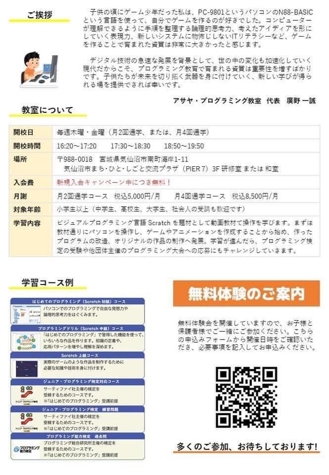 仕事内容 子供向け(主に小学生)のプログラミング教室の学習補助お仕事!★週2日の短時間アルバイト★ ■専門知識不要!見守り・簡単なサポートがメインです! ■子どもたちが自分のペースで自主的に学ぶスタイル (タブレット端末を使い規定のプログラミング教材を使っています) <具体的な仕事内容> 教室の運営サポートをしていただきます。 教室運営の準備、受付、進行、アドバイス、サポート役を担っていただきます。 ※難しいことは一切なし!最初はスタッフが一緒に入り、進め方のポイントや声掛けの仕方など丁寧に教えますよ! ◇プログラミング教室の概要◇ ビジュアルプログラミング言語スクラッチを題材として、動画教材で操作を学びます。まずは教材通りにパソコンを操作し、ゲームやアニメーションを作成することから始め、作ったプログラムの改造、オリジナルの作品の制作へ発展。