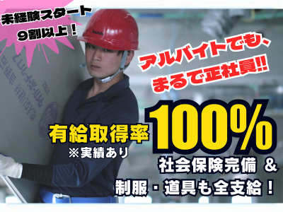 求めている人材 ◎18歳以上の方 ※高校生は今春卒業予定の方のみ可 ・学歴・経験不問 \未経験スタートが9割以上!フリーター・学生大歓迎!/ 「現場仕事は初めて」という未経験スタートの先輩が90%以上活躍しています! 丁寧な事前研修があり、現場でも先輩とのチーム制でしっかりフォローするので安心して始められますよ◎ ※もちろん、「ゆくゆくは正社員を目指したい」 「働きながら体を鍛えたい」 という方も全力で応援します◎