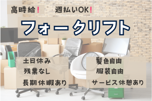 募集背景 ビジネス拡大による人員増強のため 仕事内容 高時給!週払いOK! 資格を活かせる オフィス用品を扱う倉庫内でフォークリフト作業 会社の事務所で使うようなデスクや椅子、棚などの 比較的大きいサイズの商品です。 主にフォークリフトでの移動・出荷作業をしていただきます。 困ったこと・不安なことは担当者がしっかりフォローいたしますので なんでもご相談ください。 20代~40代の男性が活躍中! フォークリフト経験者大募集です。 ぜひ、ご応募ください! ●プライベートな時間も確保しやすい! 土日休み 残業なし 有給休暇あり ●自転車・バイク通勤OK (車要相談) ●駅から徒歩10分 ●髪色自由 ●制服なし [醍醐味] 自分の努力で成果を生み出し、達成感や喜びを感じることができるお仕事です。 [こんな人が活躍] 株式会社Rian Japanは、物流を中心に人材派遣・紹介を行う総合人材サービス会社です。 未経験から始められる仕分けやフォークリフト作業、現場管理など幅広い職種を募集しています。