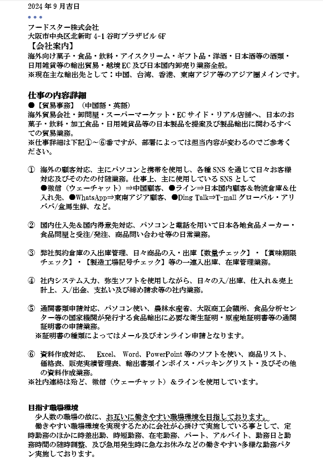 求めている人材 【必須条件】 ・外国語、特に中国語が出来る方 ・Word、Excelの基本的なPC操作ができる方 (Excelは関数不要) 【歓迎条件】 ・事務未経験の方も歓迎します! ・貿易事務の経験がある方 ・中国語または英語で日常会話や メール対応ができる方 ・子育てと仕事を両立したい主婦・主夫の方 ・グローバルな環境で働きたい方 【求める人物像】 ・新しい知識を積極的に学ぶ意欲がある方 ・明るく、コミュニケーションを円滑にとれる方 ・地道な作業もコツコツと取り組める方 ・責任感を持って仕事に取り組める方