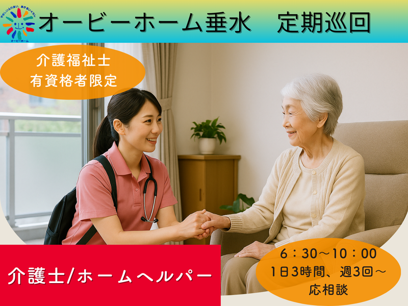 仕事内容 定期巡回(訪問介護)の介護職・ヘルパー 早朝バイト 募集 *社会福祉法人丸(オービーホーム)が募集する正式な求人です* 【定期巡回とは?】 1回10分~20分の短時間で安否確認、服薬介助、着替え、食事、排泄、移乗・移動、 買い物等の訪問を中心に1日の間に複数回、同じご利用者の自宅に定期的に訪問します。 ご利用者には必ず訪問看護との連携がありますので、何かあればすぐに看護師に相談できる環境が整っています。 24時間365日対応ですが、深夜・早朝のコールの多くは電話のみで安心していただけることが多く、 日中のサービス提供になることが多いです。 最初は先輩スタッフが同行しますので、介護経験はあるけれど訪問は未経験と言う方も安心です。 【早朝に多い依頼 】 おむつパットの交換 ごみ捨て 朝食準備 デイサービスへの送り出し 等 訪問中に携帯からケア記録の入力をお願いします。 ☆業務に慣れれば、ご自宅から直行直帰も可能です。 従事すべき業務の変更の範囲なし 転勤の可能性なし