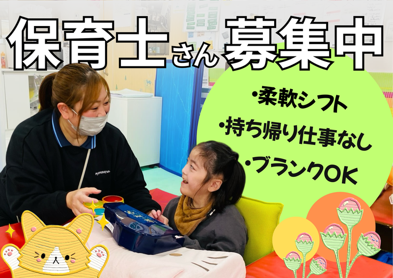 求めている人材 ≪応募条件≫ 保育士 ・性別不問 ・障がい児支援初めてでもOK ・ブランクある方もOK ・新卒・第二新卒歓迎 ・子ども一人ひとりに寄り添った関わりがしたい方